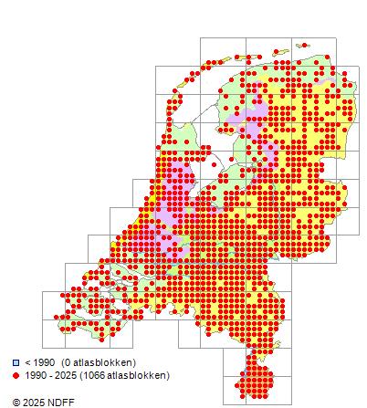 Het aantal atlasblokken (5x5 km) waarin de soort is gemeld binnen een periode van vijf jaar (vanaf 1980) of twintig jaar. Niet gecorrigeerd voor waarnemersinspanning en het aantal doorgegeven waarnemingen kan sterk variëren per periode, dus een trend in verspreiding kan hier niet direct uit worden afgelezen. Het opgegeven jaartal is het eerste jaar van de periode. Bron: gevalideerde waarnemingen uit de NDFF.