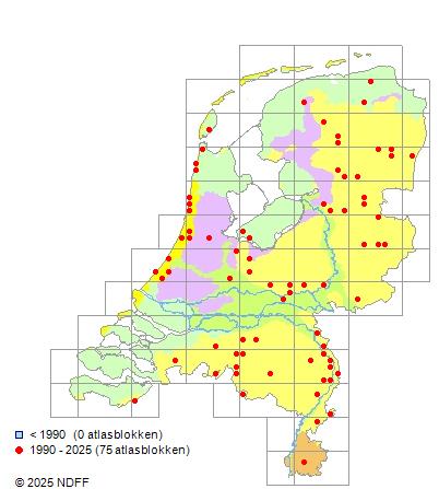 Het aantal atlasblokken (5x5 km) waarin de soort is gemeld binnen een periode van vijf jaar (vanaf 1980) of twintig jaar. Niet gecorrigeerd voor waarnemersinspanning en het aantal doorgegeven waarnemingen kan sterk variëren per periode, dus een trend in verspreiding kan hier niet direct uit worden afgelezen. Het opgegeven jaartal is het eerste jaar van de periode. Bron: gevalideerde waarnemingen uit de NDFF.