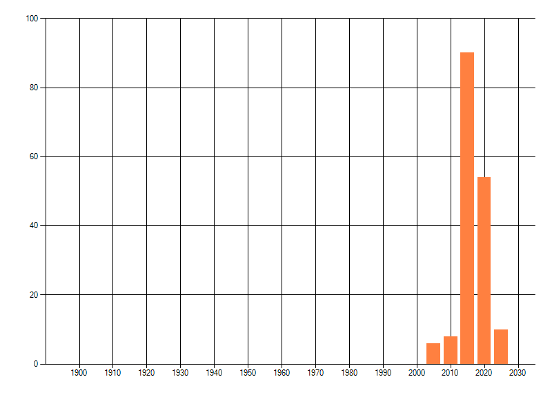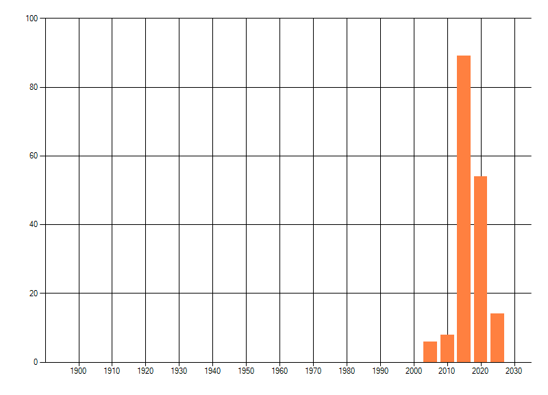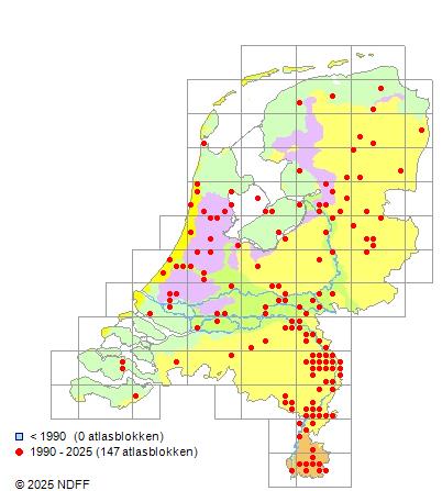 Het aantal atlasblokken (5x5 km) waarin de soort is gemeld binnen een periode van vijf jaar (vanaf 1980) of twintig jaar. Niet gecorrigeerd voor waarnemersinspanning en het aantal doorgegeven waarnemingen kan sterk variëren per periode, dus een trend in verspreiding kan hier niet direct uit worden afgelezen. Het opgegeven jaartal is het eerste jaar van de periode. Bron: gevalideerde waarnemingen uit de NDFF.