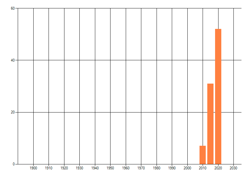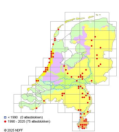 Het aantal atlasblokken (5x5 km) waarin de soort is gemeld binnen een periode van vijf jaar (vanaf 1980) of twintig jaar. Niet gecorrigeerd voor waarnemersinspanning en het aantal doorgegeven waarnemingen kan sterk variëren per periode, dus een trend in verspreiding kan hier niet direct uit worden afgelezen. Het opgegeven jaartal is het eerste jaar van de periode. Bron: gevalideerde waarnemingen uit de NDFF.