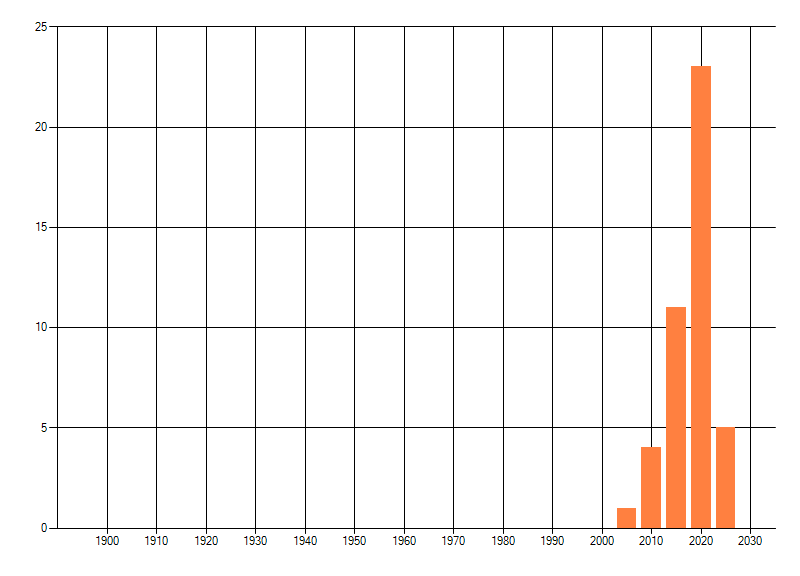 Het aantal atlasblokken (5x5 km) waarin de soort is gemeld binnen een periode van vijf jaar (vanaf 1980) of twintig jaar. Niet gecorrigeerd voor waarnemersinspanning en het aantal doorgegeven waarnemingen kan sterk variëren per periode, dus een trend in verspreiding kan hier niet direct uit worden afgelezen. Het opgegeven jaartal is het eerste jaar van de periode. Bron: gevalideerde waarnemingen uit de NDFF.