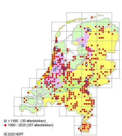 Het aantal atlasblokken (5x5 km) waarin de soort is gemeld binnen een periode van vijf jaar (vanaf 1980) of twintig jaar. Niet gecorrigeerd voor waarnemersinspanning en het aantal doorgegeven waarnemingen kan sterk variëren per periode, dus een trend in verspreiding kan hier niet direct uit worden afgelezen. Het opgegeven jaartal is het eerste jaar van de periode. Bron: gevalideerde waarnemingen uit de NDFF.