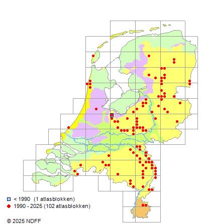 Het aantal atlasblokken (5x5 km) waarin de soort is gemeld binnen een periode van vijf jaar (vanaf 1980) of twintig jaar. Niet gecorrigeerd voor waarnemersinspanning en het aantal doorgegeven waarnemingen kan sterk variëren per periode, dus een trend in verspreiding kan hier niet direct uit worden afgelezen. Het opgegeven jaartal is het eerste jaar van de periode. Bron: gevalideerde waarnemingen uit de NDFF.