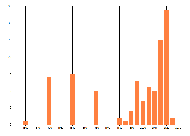 Het aantal atlasblokken (5x5 km) waarin de soort is gemeld binnen een periode van vijf jaar (vanaf 1980) of twintig jaar. Niet gecorrigeerd voor waarnemersinspanning en het aantal doorgegeven waarnemingen kan sterk variëren per periode, dus een trend in verspreiding kan hier niet direct uit worden afgelezen. Het opgegeven jaartal is het eerste jaar van de periode. Bron: gevalideerde waarnemingen uit de NDFF.