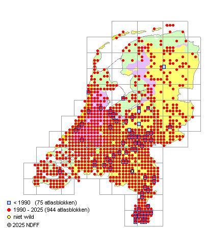 Het aantal atlasblokken (5x5 km) waarin de soort is gemeld binnen een periode van vijf jaar (vanaf 1980) of twintig jaar. Niet gecorrigeerd voor waarnemersinspanning en het aantal doorgegeven waarnemingen kan sterk variëren per periode, dus een trend in verspreiding kan hier niet direct uit worden afgelezen. Het opgegeven jaartal is het eerste jaar van de periode. Bron: gevalideerde waarnemingen uit de NDFF.