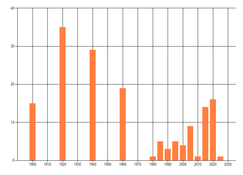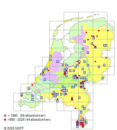 Het aantal atlasblokken (5x5 km) waarin de soort is gemeld binnen een periode van vijf jaar (vanaf 1980) of twintig jaar. Niet gecorrigeerd voor waarnemersinspanning en het aantal doorgegeven waarnemingen kan sterk variëren per periode, dus een trend in verspreiding kan hier niet direct uit worden afgelezen. Het opgegeven jaartal is het eerste jaar van de periode. Bron: gevalideerde waarnemingen uit de NDFF.