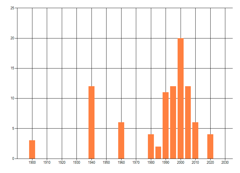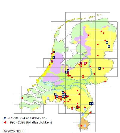 Het aantal atlasblokken (5x5 km) waarin de soort is gemeld binnen een periode van vijf jaar (vanaf 1980) of twintig jaar. Niet gecorrigeerd voor waarnemersinspanning en het aantal doorgegeven waarnemingen kan sterk variëren per periode, dus een trend in verspreiding kan hier niet direct uit worden afgelezen. Het opgegeven jaartal is het eerste jaar van de periode. Bron: gevalideerde waarnemingen uit de NDFF.