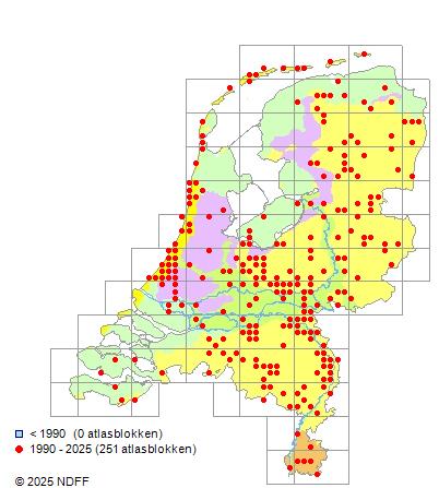 Het aantal atlasblokken (5x5 km) waarin de soort is gemeld binnen een periode van vijf jaar (vanaf 1980) of twintig jaar. Niet gecorrigeerd voor waarnemersinspanning en het aantal doorgegeven waarnemingen kan sterk variëren per periode, dus een trend in verspreiding kan hier niet direct uit worden afgelezen. Het opgegeven jaartal is het eerste jaar van de periode. Bron: gevalideerde waarnemingen uit de NDFF.