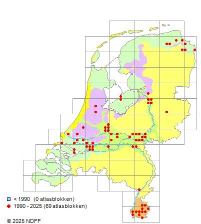 Het aantal atlasblokken (5x5 km) waarin de soort is gemeld binnen een periode van vijf jaar (vanaf 1980) of twintig jaar. Niet gecorrigeerd voor waarnemersinspanning en het aantal doorgegeven waarnemingen kan sterk variëren per periode, dus een trend in verspreiding kan hier niet direct uit worden afgelezen. Het opgegeven jaartal is het eerste jaar van de periode. Bron: gevalideerde waarnemingen uit de NDFF.