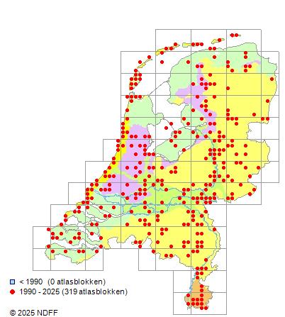 Het aantal atlasblokken (5x5 km) waarin de soort is gemeld binnen een periode van vijf jaar (vanaf 1980) of twintig jaar. Niet gecorrigeerd voor waarnemersinspanning en het aantal doorgegeven waarnemingen kan sterk variëren per periode, dus een trend in verspreiding kan hier niet direct uit worden afgelezen. Het opgegeven jaartal is het eerste jaar van de periode. Bron: gevalideerde waarnemingen uit de NDFF.