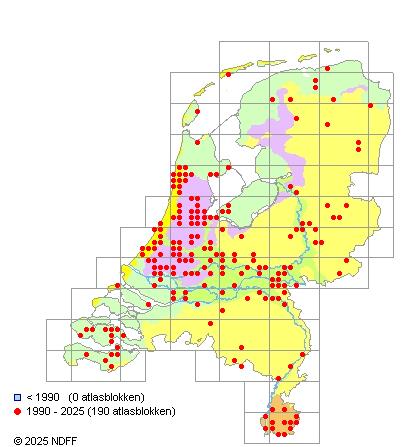 Het aantal atlasblokken (5x5 km) waarin de soort is gemeld binnen een periode van vijf jaar (vanaf 1980) of twintig jaar. Niet gecorrigeerd voor waarnemersinspanning en het aantal doorgegeven waarnemingen kan sterk variëren per periode, dus een trend in verspreiding kan hier niet direct uit worden afgelezen. Het opgegeven jaartal is het eerste jaar van de periode. Bron: gevalideerde waarnemingen uit de NDFF.