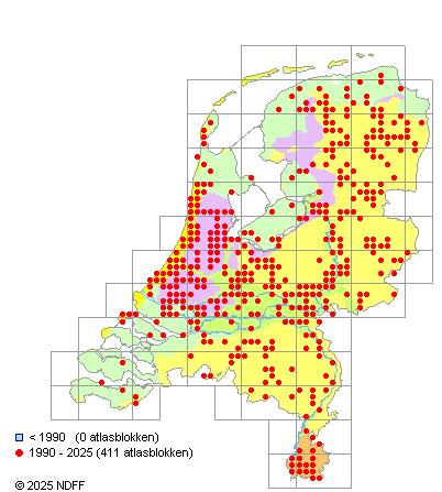 Het aantal atlasblokken (5x5 km) waarin de soort is gemeld binnen een periode van vijf jaar (vanaf 1980) of twintig jaar. Niet gecorrigeerd voor waarnemersinspanning en het aantal doorgegeven waarnemingen kan sterk variëren per periode, dus een trend in verspreiding kan hier niet direct uit worden afgelezen. Het opgegeven jaartal is het eerste jaar van de periode. Bron: gevalideerde waarnemingen uit de NDFF.