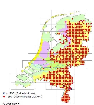 Het aantal atlasblokken (5x5 km) waarin de soort is gemeld binnen een periode van vijf jaar (vanaf 1980) of twintig jaar. Niet gecorrigeerd voor waarnemersinspanning en het aantal doorgegeven waarnemingen kan sterk variëren per periode, dus een trend in verspreiding kan hier niet direct uit worden afgelezen. Het opgegeven jaartal is het eerste jaar van de periode. Bron: gevalideerde waarnemingen uit de NDFF.