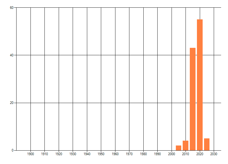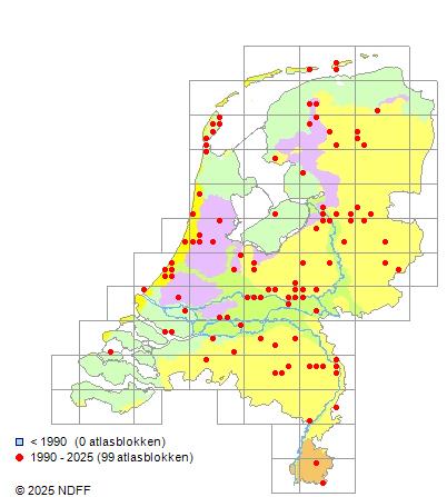 Het aantal atlasblokken (5x5 km) waarin de soort is gemeld binnen een periode van vijf jaar (vanaf 1980) of twintig jaar. Niet gecorrigeerd voor waarnemersinspanning en het aantal doorgegeven waarnemingen kan sterk variëren per periode, dus een trend in verspreiding kan hier niet direct uit worden afgelezen. Het opgegeven jaartal is het eerste jaar van de periode. Bron: gevalideerde waarnemingen uit de NDFF.
