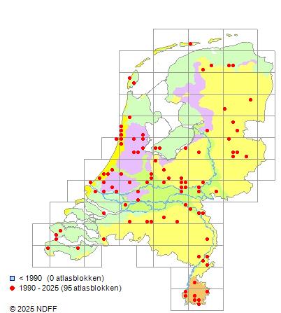 Het aantal atlasblokken (5x5 km) waarin de soort is gemeld binnen een periode van vijf jaar (vanaf 1980) of twintig jaar. Niet gecorrigeerd voor waarnemersinspanning en het aantal doorgegeven waarnemingen kan sterk variëren per periode, dus een trend in verspreiding kan hier niet direct uit worden afgelezen. Het opgegeven jaartal is het eerste jaar van de periode. Bron: gevalideerde waarnemingen uit de NDFF.