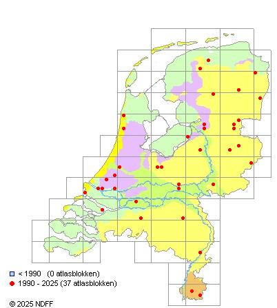 Het aantal atlasblokken (5x5 km) waarin de soort is gemeld binnen een periode van vijf jaar (vanaf 1980) of twintig jaar. Niet gecorrigeerd voor waarnemersinspanning en het aantal doorgegeven waarnemingen kan sterk variëren per periode, dus een trend in verspreiding kan hier niet direct uit worden afgelezen. Het opgegeven jaartal is het eerste jaar van de periode. Bron: gevalideerde waarnemingen uit de NDFF.