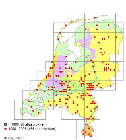 Het aantal atlasblokken (5x5 km) waarin de soort is gemeld binnen een periode van vijf jaar (vanaf 1980) of twintig jaar. Niet gecorrigeerd voor waarnemersinspanning en het aantal doorgegeven waarnemingen kan sterk variëren per periode, dus een trend in verspreiding kan hier niet direct uit worden afgelezen. Het opgegeven jaartal is het eerste jaar van de periode. Bron: gevalideerde waarnemingen uit de NDFF.