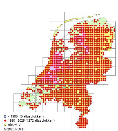 Het aantal atlasblokken (5x5 km) waarin de soort is gemeld binnen een periode van vijf jaar (vanaf 1980) of twintig jaar. Niet gecorrigeerd voor waarnemersinspanning en het aantal doorgegeven waarnemingen kan sterk variëren per periode, dus een trend in verspreiding kan hier niet direct uit worden afgelezen. Het opgegeven jaartal is het eerste jaar van de periode. Bron: gevalideerde waarnemingen uit de NDFF.