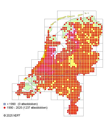 Het aantal atlasblokken (5x5 km) waarin de soort is gemeld binnen een periode van vijf jaar (vanaf 1980) of twintig jaar. Niet gecorrigeerd voor waarnemersinspanning en het aantal doorgegeven waarnemingen kan sterk variëren per periode, dus een trend in verspreiding kan hier niet direct uit worden afgelezen. Het opgegeven jaartal is het eerste jaar van de periode. Bron: gevalideerde waarnemingen uit de NDFF.