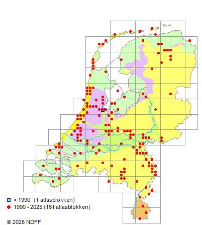 Het aantal atlasblokken (5x5 km) waarin de soort is gemeld binnen een periode van vijf jaar (vanaf 1980) of twintig jaar. Niet gecorrigeerd voor waarnemersinspanning en het aantal doorgegeven waarnemingen kan sterk variëren per periode, dus een trend in verspreiding kan hier niet direct uit worden afgelezen. Het opgegeven jaartal is het eerste jaar van de periode. Bron: gevalideerde waarnemingen uit de NDFF.