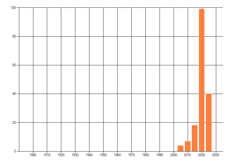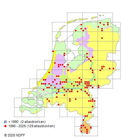 Het aantal atlasblokken (5x5 km) waarin de soort is gemeld binnen een periode van vijf jaar (vanaf 1980) of twintig jaar. Niet gecorrigeerd voor waarnemersinspanning en het aantal doorgegeven waarnemingen kan sterk variëren per periode, dus een trend in verspreiding kan hier niet direct uit worden afgelezen. Het opgegeven jaartal is het eerste jaar van de periode. Bron: gevalideerde waarnemingen uit de NDFF.