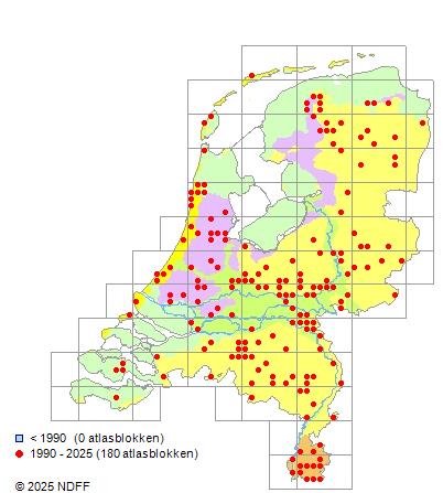 Het aantal atlasblokken (5x5 km) waarin de soort is gemeld binnen een periode van vijf jaar (vanaf 1980) of twintig jaar. Niet gecorrigeerd voor waarnemersinspanning en het aantal doorgegeven waarnemingen kan sterk variëren per periode, dus een trend in verspreiding kan hier niet direct uit worden afgelezen. Het opgegeven jaartal is het eerste jaar van de periode. Bron: gevalideerde waarnemingen uit de NDFF.