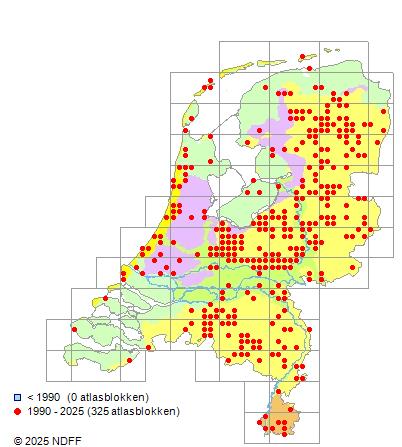 Het aantal atlasblokken (5x5 km) waarin de soort is gemeld binnen een periode van vijf jaar (vanaf 1980) of twintig jaar. Niet gecorrigeerd voor waarnemersinspanning en het aantal doorgegeven waarnemingen kan sterk variëren per periode, dus een trend in verspreiding kan hier niet direct uit worden afgelezen. Het opgegeven jaartal is het eerste jaar van de periode. Bron: gevalideerde waarnemingen uit de NDFF.