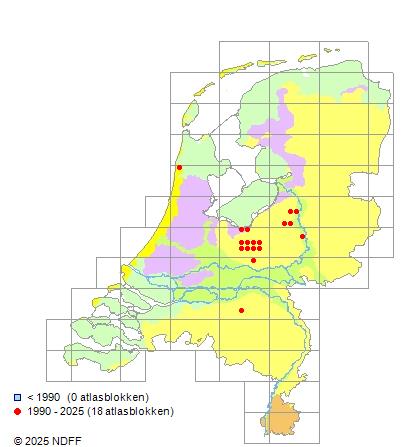 Het aantal atlasblokken (5x5 km) waarin de soort is gemeld binnen een periode van vijf jaar (vanaf 1980) of twintig jaar. Niet gecorrigeerd voor waarnemersinspanning en het aantal doorgegeven waarnemingen kan sterk variëren per periode, dus een trend in verspreiding kan hier niet direct uit worden afgelezen. Het opgegeven jaartal is het eerste jaar van de periode. Bron: gevalideerde waarnemingen uit de NDFF.