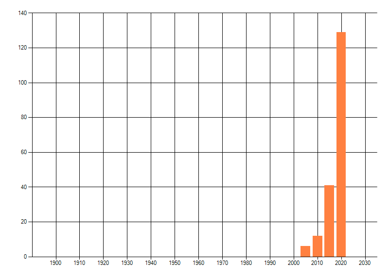 Het aantal atlasblokken (5x5 km) waarin de soort is gemeld binnen een periode van vijf jaar (vanaf 1980) of twintig jaar. Niet gecorrigeerd voor waarnemersinspanning en het aantal doorgegeven waarnemingen kan sterk variëren per periode, dus een trend in verspreiding kan hier niet direct uit worden afgelezen. Het opgegeven jaartal is het eerste jaar van de periode. Bron: gevalideerde waarnemingen uit de NDFF.