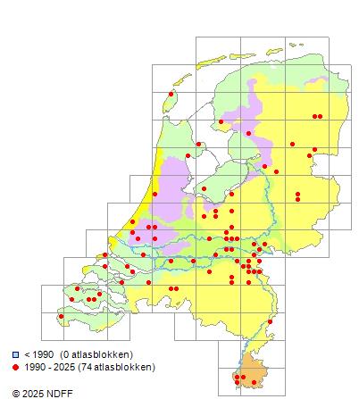Het aantal atlasblokken (5x5 km) waarin de soort is gemeld binnen een periode van vijf jaar (vanaf 1980) of twintig jaar. Niet gecorrigeerd voor waarnemersinspanning en het aantal doorgegeven waarnemingen kan sterk variëren per periode, dus een trend in verspreiding kan hier niet direct uit worden afgelezen. Het opgegeven jaartal is het eerste jaar van de periode. Bron: gevalideerde waarnemingen uit de NDFF.
