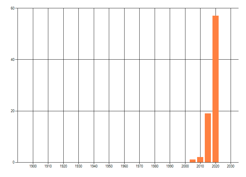Het aantal atlasblokken (5x5 km) waarin de soort is gemeld binnen een periode van vijf jaar (vanaf 1980) of twintig jaar. Niet gecorrigeerd voor waarnemersinspanning en het aantal doorgegeven waarnemingen kan sterk variëren per periode, dus een trend in verspreiding kan hier niet direct uit worden afgelezen. Het opgegeven jaartal is het eerste jaar van de periode. Bron: gevalideerde waarnemingen uit de NDFF.