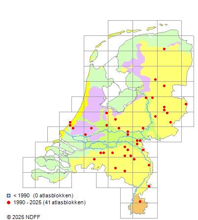 Het aantal atlasblokken (5x5 km) waarin de soort is gemeld binnen een periode van vijf jaar (vanaf 1980) of twintig jaar. Niet gecorrigeerd voor waarnemersinspanning en het aantal doorgegeven waarnemingen kan sterk variëren per periode, dus een trend in verspreiding kan hier niet direct uit worden afgelezen. Het opgegeven jaartal is het eerste jaar van de periode. Bron: gevalideerde waarnemingen uit de NDFF.