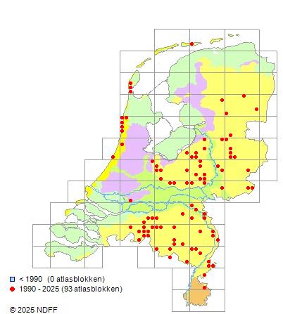 Het aantal atlasblokken (5x5 km) waarin de soort is gemeld binnen een periode van vijf jaar (vanaf 1980) of twintig jaar. Niet gecorrigeerd voor waarnemersinspanning en het aantal doorgegeven waarnemingen kan sterk variëren per periode, dus een trend in verspreiding kan hier niet direct uit worden afgelezen. Het opgegeven jaartal is het eerste jaar van de periode. Bron: gevalideerde waarnemingen uit de NDFF.