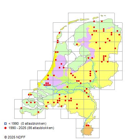 Het aantal atlasblokken (5x5 km) waarin de soort is gemeld binnen een periode van vijf jaar (vanaf 1980) of twintig jaar. Niet gecorrigeerd voor waarnemersinspanning en het aantal doorgegeven waarnemingen kan sterk variëren per periode, dus een trend in verspreiding kan hier niet direct uit worden afgelezen. Het opgegeven jaartal is het eerste jaar van de periode. Bron: gevalideerde waarnemingen uit de NDFF.