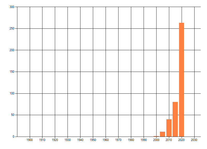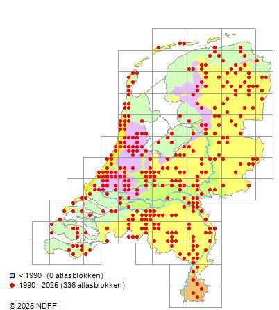 Het aantal atlasblokken (5x5 km) waarin de soort is gemeld binnen een periode van vijf jaar (vanaf 1980) of twintig jaar. Niet gecorrigeerd voor waarnemersinspanning en het aantal doorgegeven waarnemingen kan sterk variëren per periode, dus een trend in verspreiding kan hier niet direct uit worden afgelezen. Het opgegeven jaartal is het eerste jaar van de periode. Bron: gevalideerde waarnemingen uit de NDFF.