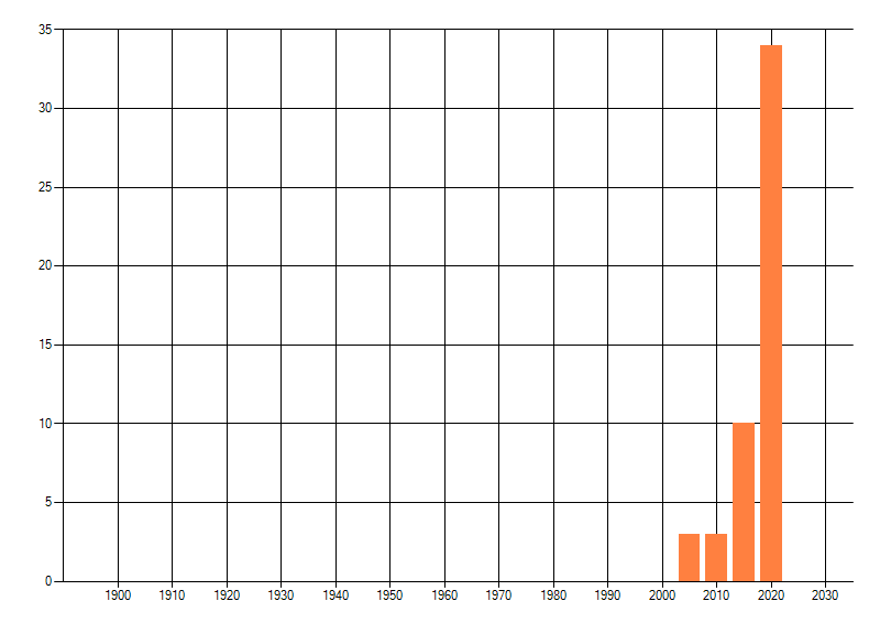 Het aantal atlasblokken (5x5 km) waarin de soort is gemeld binnen een periode van vijf jaar (vanaf 1980) of twintig jaar. Niet gecorrigeerd voor waarnemersinspanning en het aantal doorgegeven waarnemingen kan sterk variëren per periode, dus een trend in verspreiding kan hier niet direct uit worden afgelezen. Het opgegeven jaartal is het eerste jaar van de periode. Bron: gevalideerde waarnemingen uit de NDFF.