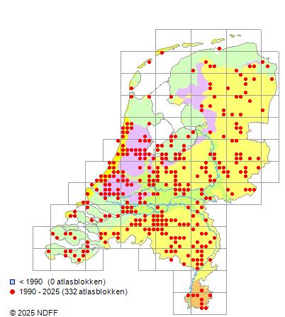 Het aantal atlasblokken (5x5 km) waarin de soort is gemeld binnen een periode van vijf jaar (vanaf 1980) of twintig jaar. Niet gecorrigeerd voor waarnemersinspanning en het aantal doorgegeven waarnemingen kan sterk variëren per periode, dus een trend in verspreiding kan hier niet direct uit worden afgelezen. Het opgegeven jaartal is het eerste jaar van de periode. Bron: gevalideerde waarnemingen uit de NDFF.