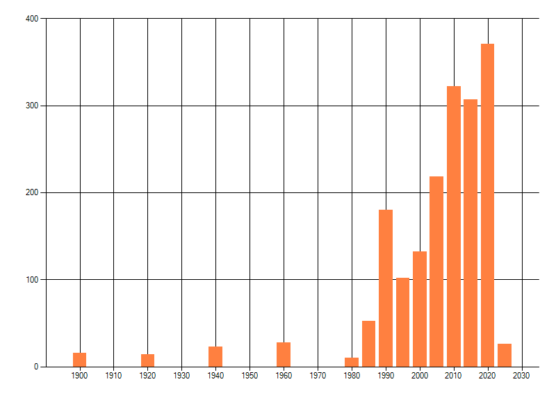 Het aantal atlasblokken (5x5 km) waarin de soort is gemeld binnen een periode van vijf jaar (vanaf 1980) of twintig jaar. Niet gecorrigeerd voor waarnemersinspanning en het aantal doorgegeven waarnemingen kan sterk variëren per periode, dus een trend in verspreiding kan hier niet direct uit worden afgelezen. Het opgegeven jaartal is het eerste jaar van de periode. Bron: gevalideerde waarnemingen uit de NDFF.