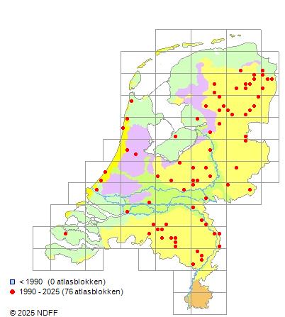 Het aantal atlasblokken (5x5 km) waarin de soort is gemeld binnen een periode van vijf jaar (vanaf 1980) of twintig jaar. Niet gecorrigeerd voor waarnemersinspanning en het aantal doorgegeven waarnemingen kan sterk variëren per periode, dus een trend in verspreiding kan hier niet direct uit worden afgelezen. Het opgegeven jaartal is het eerste jaar van de periode. Bron: gevalideerde waarnemingen uit de NDFF.