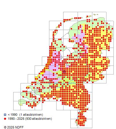 Het aantal atlasblokken (5x5 km) waarin de soort is gemeld binnen een periode van vijf jaar (vanaf 1980) of twintig jaar. Niet gecorrigeerd voor waarnemersinspanning en het aantal doorgegeven waarnemingen kan sterk variëren per periode, dus een trend in verspreiding kan hier niet direct uit worden afgelezen. Het opgegeven jaartal is het eerste jaar van de periode. Bron: gevalideerde waarnemingen uit de NDFF.