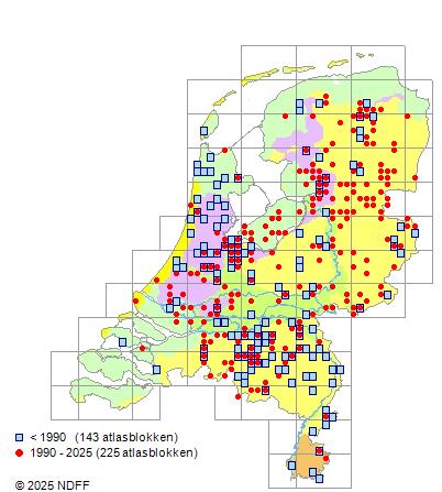 Het aantal atlasblokken (5x5 km) waarin de soort is gemeld binnen een periode van vijf jaar (vanaf 1980) of twintig jaar. Niet gecorrigeerd voor waarnemersinspanning en het aantal doorgegeven waarnemingen kan sterk variëren per periode, dus een trend in verspreiding kan hier niet direct uit worden afgelezen. Het opgegeven jaartal is het eerste jaar van de periode. Bron: gevalideerde waarnemingen uit de NDFF.