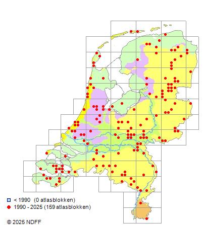 Het aantal atlasblokken (5x5 km) waarin de soort is gemeld binnen een periode van vijf jaar (vanaf 1980) of twintig jaar. Niet gecorrigeerd voor waarnemersinspanning en het aantal doorgegeven waarnemingen kan sterk variëren per periode, dus een trend in verspreiding kan hier niet direct uit worden afgelezen. Het opgegeven jaartal is het eerste jaar van de periode. Bron: gevalideerde waarnemingen uit de NDFF.