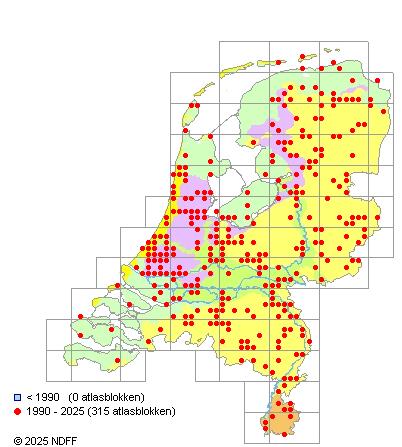 Het aantal atlasblokken (5x5 km) waarin de soort is gemeld binnen een periode van vijf jaar (vanaf 1980) of twintig jaar. Niet gecorrigeerd voor waarnemersinspanning en het aantal doorgegeven waarnemingen kan sterk variëren per periode, dus een trend in verspreiding kan hier niet direct uit worden afgelezen. Het opgegeven jaartal is het eerste jaar van de periode. Bron: gevalideerde waarnemingen uit de NDFF.