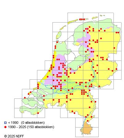 Het aantal atlasblokken (5x5 km) waarin de soort is gemeld binnen een periode van vijf jaar (vanaf 1980) of twintig jaar. Niet gecorrigeerd voor waarnemersinspanning en het aantal doorgegeven waarnemingen kan sterk variëren per periode, dus een trend in verspreiding kan hier niet direct uit worden afgelezen. Het opgegeven jaartal is het eerste jaar van de periode. Bron: gevalideerde waarnemingen uit de NDFF.
