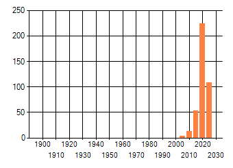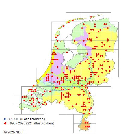 Het aantal atlasblokken (5x5 km) waarin de soort is gemeld binnen een periode van vijf jaar (vanaf 1980) of twintig jaar. Niet gecorrigeerd voor waarnemersinspanning en het aantal doorgegeven waarnemingen kan sterk variëren per periode, dus een trend in verspreiding kan hier niet direct uit worden afgelezen. Het opgegeven jaartal is het eerste jaar van de periode. Bron: gevalideerde waarnemingen uit de NDFF.