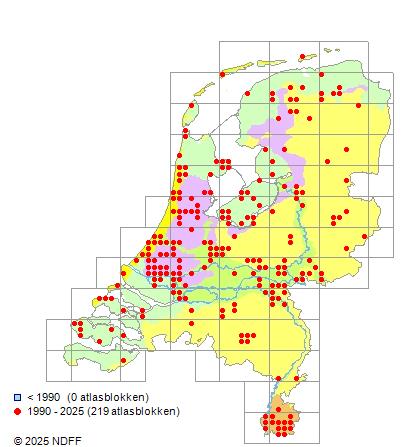 Het aantal atlasblokken (5x5 km) waarin de soort is gemeld binnen een periode van vijf jaar (vanaf 1980) of twintig jaar. Niet gecorrigeerd voor waarnemersinspanning en het aantal doorgegeven waarnemingen kan sterk variëren per periode, dus een trend in verspreiding kan hier niet direct uit worden afgelezen. Het opgegeven jaartal is het eerste jaar van de periode. Bron: gevalideerde waarnemingen uit de NDFF.