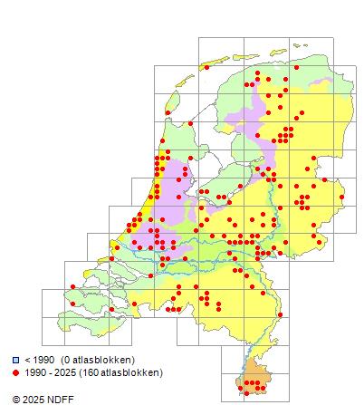 Het aantal atlasblokken (5x5 km) waarin de soort is gemeld binnen een periode van vijf jaar (vanaf 1980) of twintig jaar. Niet gecorrigeerd voor waarnemersinspanning en het aantal doorgegeven waarnemingen kan sterk variëren per periode, dus een trend in verspreiding kan hier niet direct uit worden afgelezen. Het opgegeven jaartal is het eerste jaar van de periode. Bron: gevalideerde waarnemingen uit de NDFF.