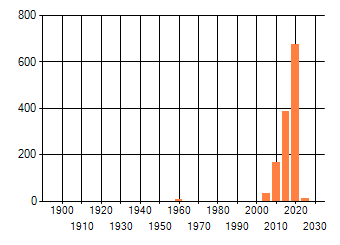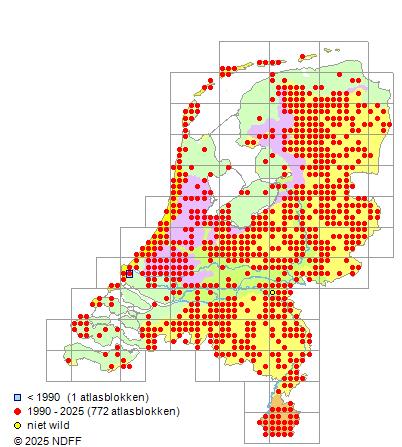 Het aantal atlasblokken (5x5 km) waarin de soort is gemeld binnen een periode van vijf jaar (vanaf 1980) of twintig jaar. Niet gecorrigeerd voor waarnemersinspanning en het aantal doorgegeven waarnemingen kan sterk variëren per periode, dus een trend in verspreiding kan hier niet direct uit worden afgelezen. Het opgegeven jaartal is het eerste jaar van de periode. Bron: gevalideerde waarnemingen uit de NDFF.