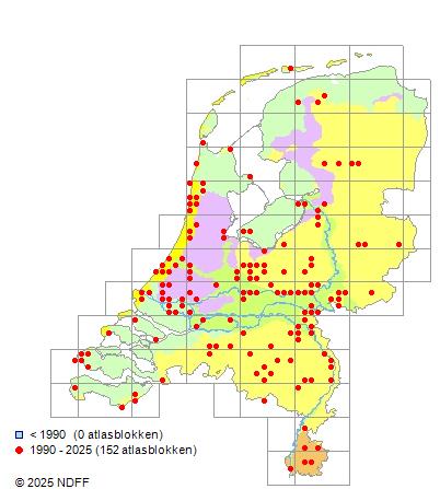 Het aantal atlasblokken (5x5 km) waarin de soort is gemeld binnen een periode van vijf jaar (vanaf 1980) of twintig jaar. Niet gecorrigeerd voor waarnemersinspanning en het aantal doorgegeven waarnemingen kan sterk variëren per periode, dus een trend in verspreiding kan hier niet direct uit worden afgelezen. Het opgegeven jaartal is het eerste jaar van de periode. Bron: gevalideerde waarnemingen uit de NDFF.