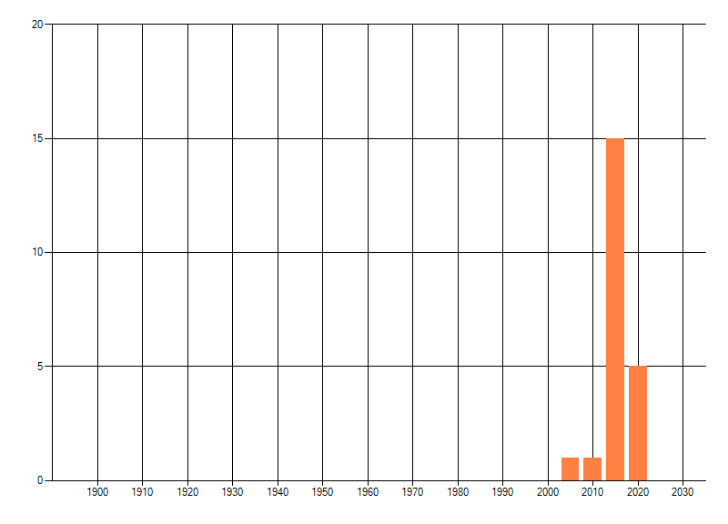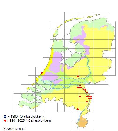 Het aantal atlasblokken (5x5 km) waarin de soort is gemeld binnen een periode van vijf jaar (vanaf 1980) of twintig jaar. Niet gecorrigeerd voor waarnemersinspanning en het aantal doorgegeven waarnemingen kan sterk variëren per periode, dus een trend in verspreiding kan hier niet direct uit worden afgelezen. Het opgegeven jaartal is het eerste jaar van de periode. Bron: gevalideerde waarnemingen uit de NDFF.